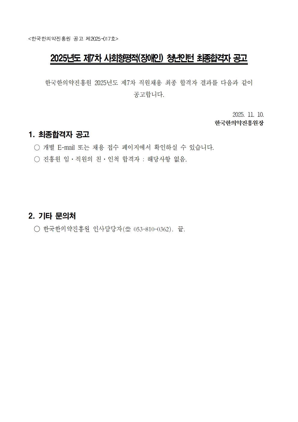 한국한의약진흥원 2025년도 제7차 채용 사회형평적(장애인) 청년인턴 최종 합격자 공고