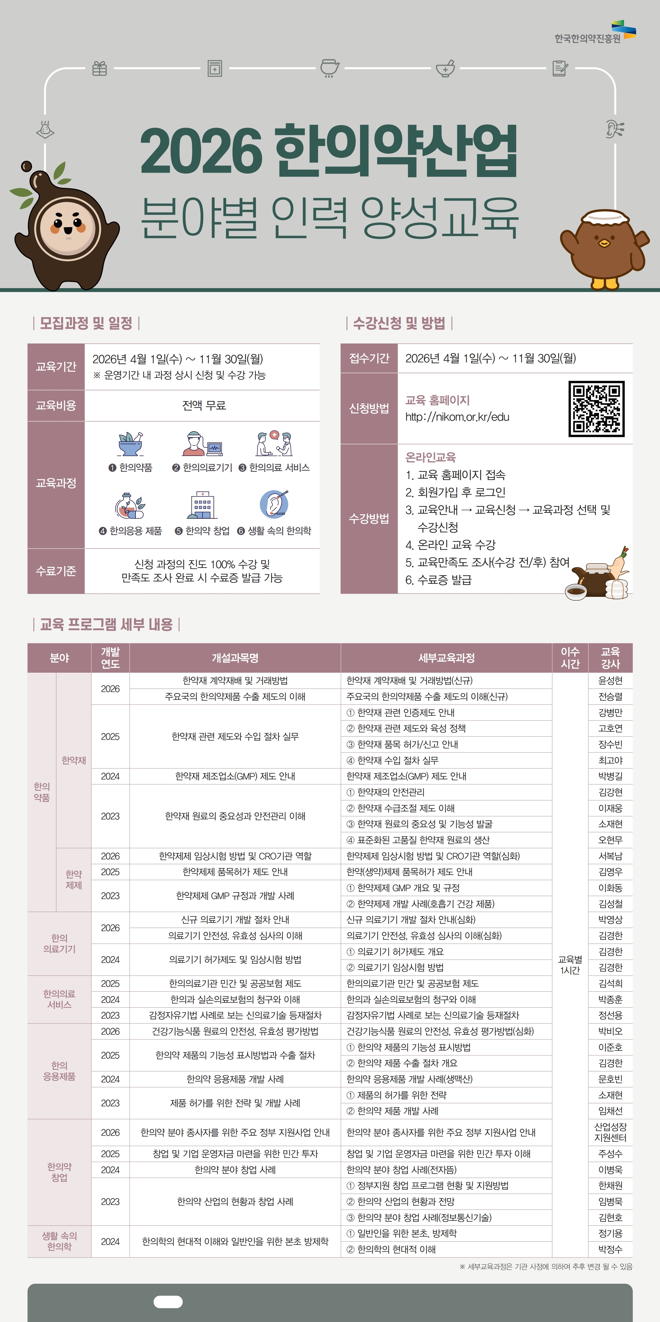 한의약 산업 분야 인력 양성을 위한「2026년 한의약 산업 분야별 인력양성 교육」운영을 안내드립니다.