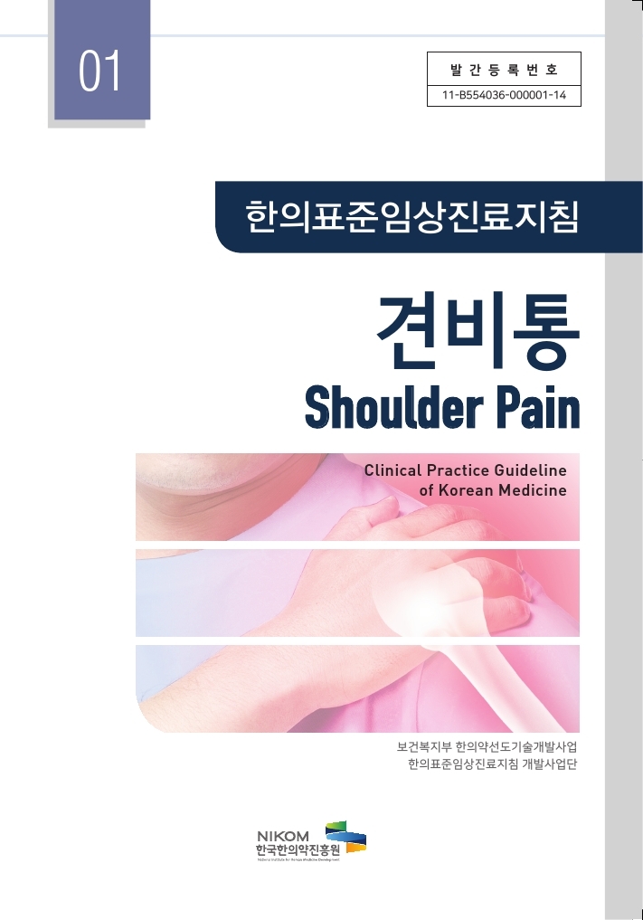 Shoulder pain is a common disease that 20 to 40 percent of the entire population experience more than once in their lifetime. Shoulder pain is a painful condition associated with the surrounding tissues of the shoulder joint including scapular region and the upper extremities. the main symptoms of shoulder pain are the pain and limited range of motion of shoulder joint (external rotation, internal rotation, external rotation, and flexion). And these symptoms are related to degenerative changes, ligament injury, muscle rupture and inammation of the bursa of the shoulder joint. these include conditions such as adhesive capsulitis, rotator cuff syndrome, biceps tendonitis, calcific tendonitis, impingement syndrome, bursitis, myofascial pain syndrome and strain of shoulder joint. In the cases of pain originating from the lung, heart, cervical vertebrae and etc, shoulder pain after stroke, spinal cord injury and operation are not subject to this guideline.