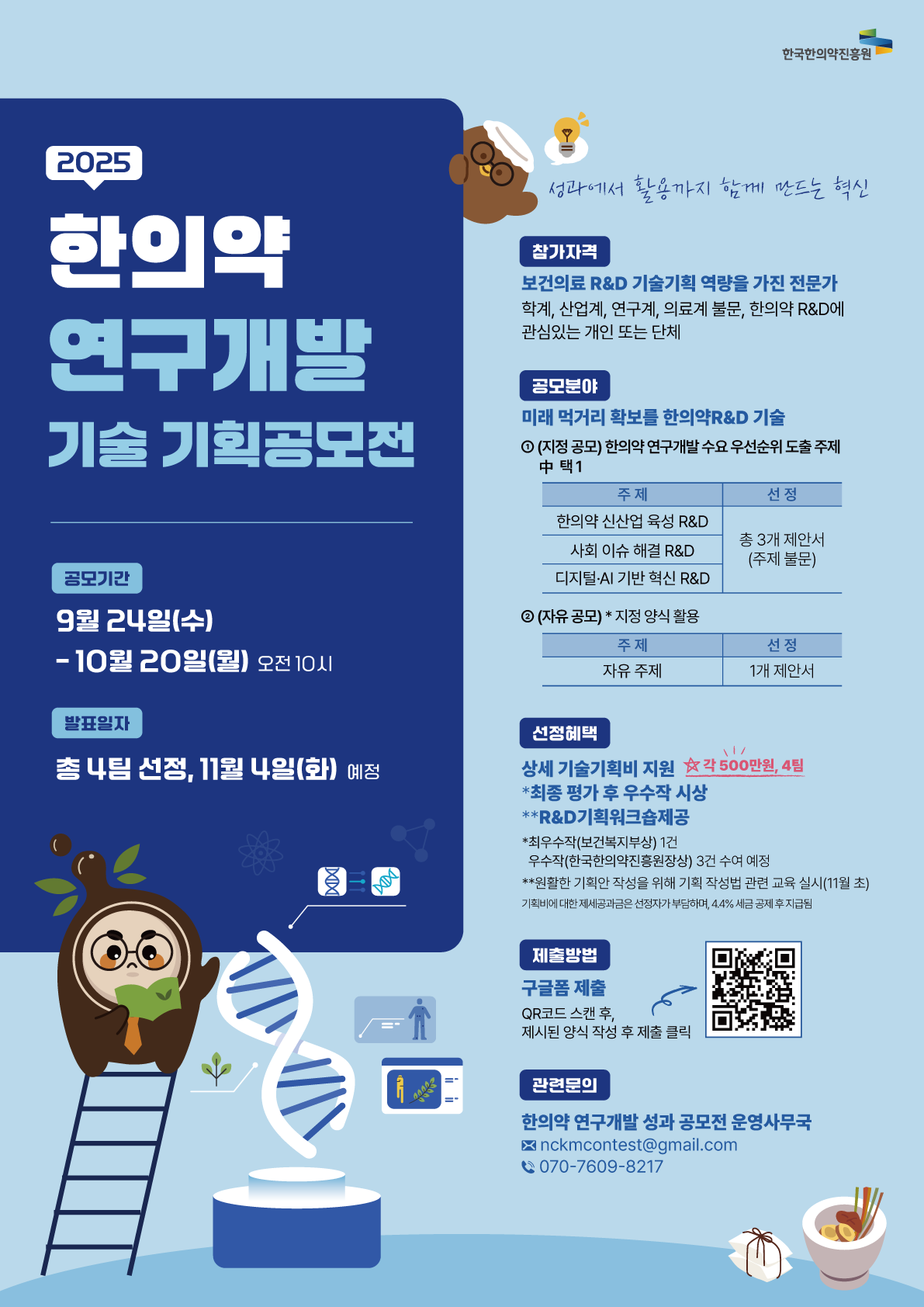 2025 한의약 연구개발 기술 기획 공모전 안내 (접수마감: 2025.10.20.(월), 10:00)