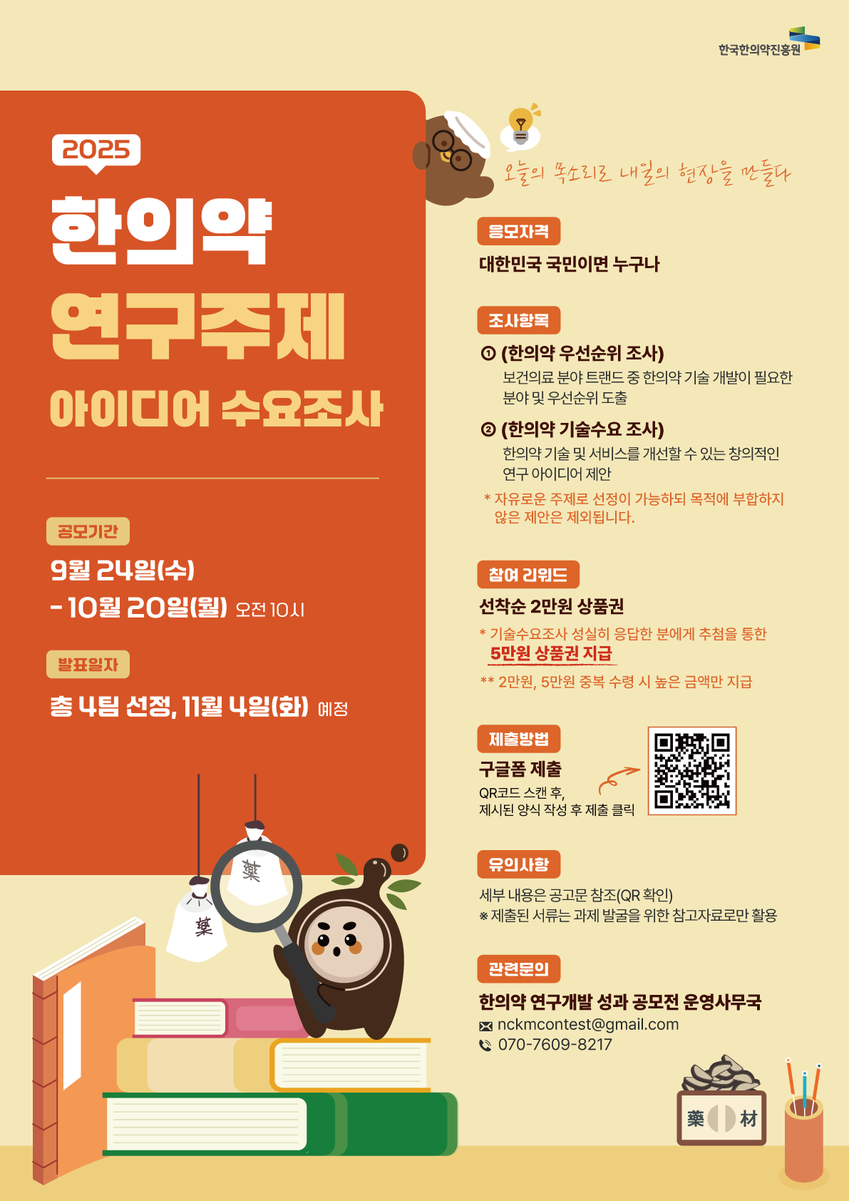 2025 한의약 연구주제 아이디어 수요조사 안내 (접수마감: 2025.10.20.(월), 10:00)