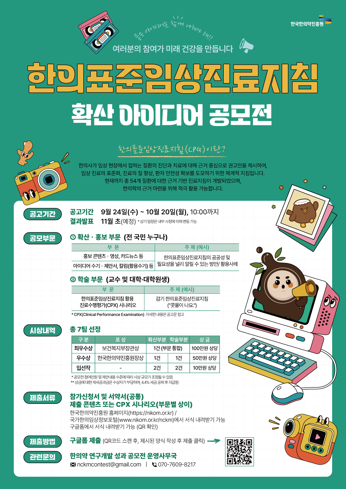 한의표준임상진료지침 확산 아이디어 공모전 안내 (접수마감: 2025.10.20.(월), 10:00)