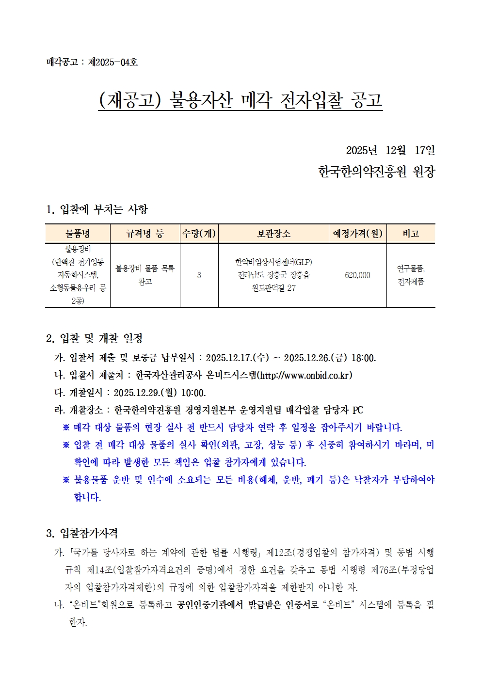 [매각 2025-04호][공고문](재공고) 한국한의약진흥원 불용자산 매각[마감 : 25-12-26(금), 18시]
