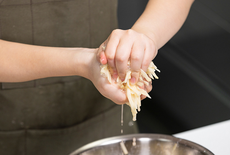 시간이 조금 지나면 감자에서 물이 생기는데 이때 손으로 감자를 짜서 따로 둡니다.