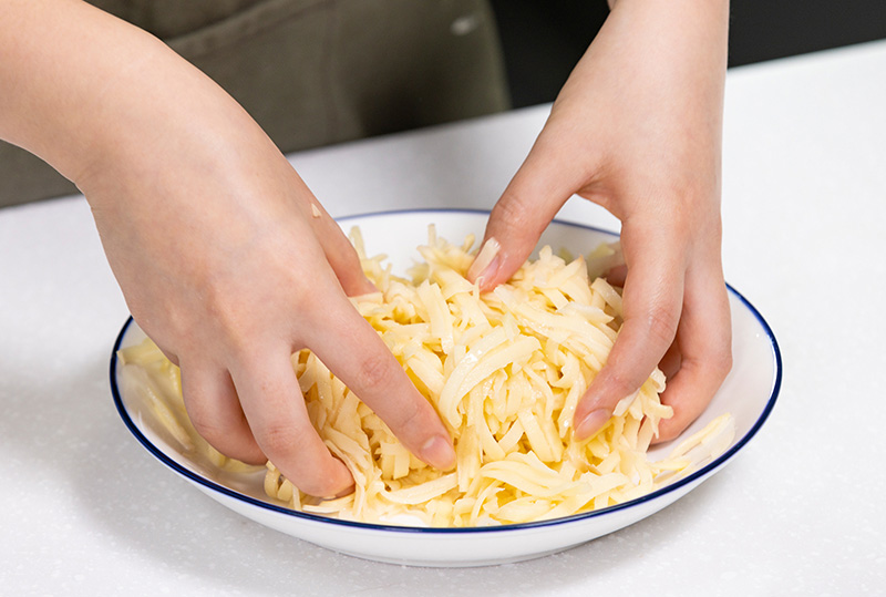 채 썬 감자에 소금을 넣고 섞습니다. 소금은 간을 하기 위한 것도 있지만 감자의 수분을 없애는 목적도 있습니다. 수분이 많으면 감자끼리 붙지 않아 모양이 흐트러집니다.