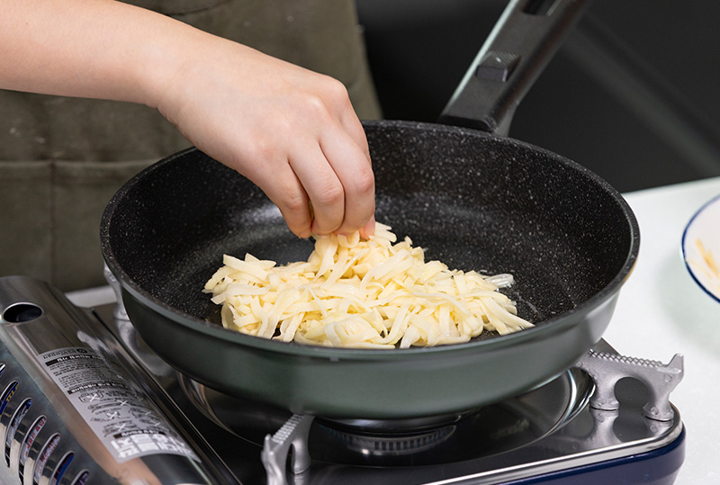 기름을 두른 프라이팬에 감자를 얇게 펴서 올리고 약불에서 천천히 굽습니다.