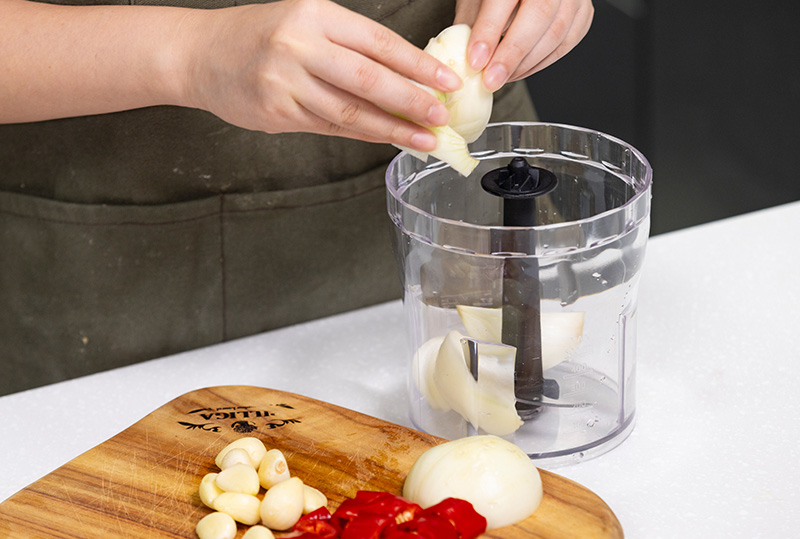홍고추와 양파 일부, 새우젓을 믹서에 넣고 곱게 갈아 줍니다.