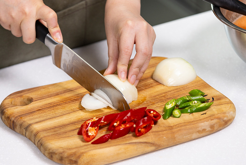 남은 양파와 홍고추, 풋고추도 잘게 썰어서 넣어 줍니다.
