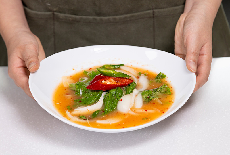 ‘상추’라는 이름은 생으로 먹는 채소라는 뜻의 ‘생채’라는 말에서 유래했다고 합니다. 〈동의보감〉에는 상추를 ‘와거(萵苣)’라고 부르며, 성질이 냉하고 맛이 쓰며 약간 독이 있다고 기록되어 있습니다. 상추는 오장을 편안하게 하며 가슴에 기가 막힌 것을 통하게 하고, 경맥 또한 통하게 한다고 합니다. 이런 상추로 물김치를 담가 먹는다면 발효 과정에서 생겨난 유산균과 다양한 영양소로 인해 장 건강이 더욱 좋아지겠지요. 물김치에 매운 고추로 매콤함을 더해 볼까요? 한의학에서는 매운 맛의 신미(辛味)는 기를 발산하게 하는 효과가 있다고 합니다.