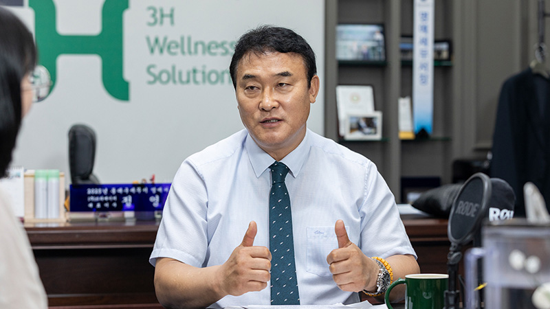 안녕하세요, 주식회사 3H 대표 정영재입니다. 2014년 법인으로 3H를 설립하여 올해 12년째네요. 주식회사 3H는 제 스스로가 건강에 고민이 많아서 설립하게 된 회사입니다. 자전거를 타다가 높은 곳에서 추락하면서 크게 다친 적이 있었는데, 그 이후 허리가 항상 아팠습니다. 이 문제를 해결할 방법이 없는지 고민하다가, 한의학에서 “매일 지압과 뜸을 하면 못 고칠 병이 없다”는 말이 있다는 것을 듣고 ‘그럼 매일 사용하는 침대로 지압과 뜸을 할 수 있으면 허리 건강도 좋아지지 않을까?’하는 생각을 했습니다. 그렇게 3H를 설립하고 지압침대를 개발하게 되었습니다.