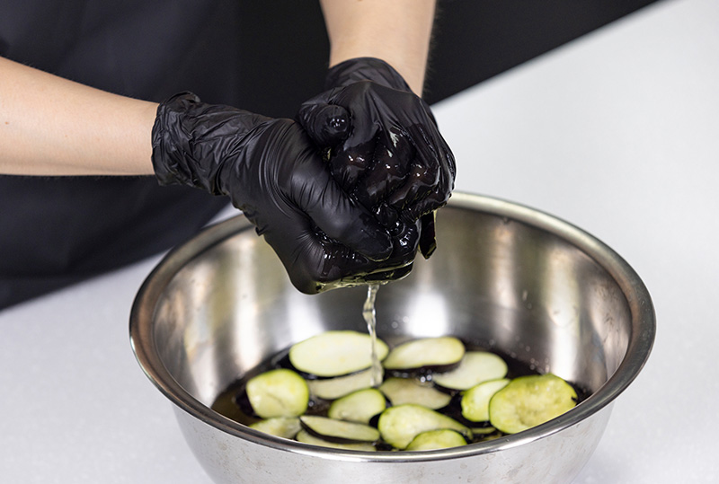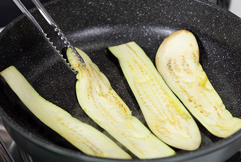 가지를 0.8~1센티미터 두께 정도로 길게 썰어 둡니다. 껍질이 많은 부분은 사용하지 않습니다. 기름을 두르지 않은 팬에 앞뒤로 구워 수분을 날려 줍니다. 불이 세면 가지가 검게 변하니 약불에 굽습니다.