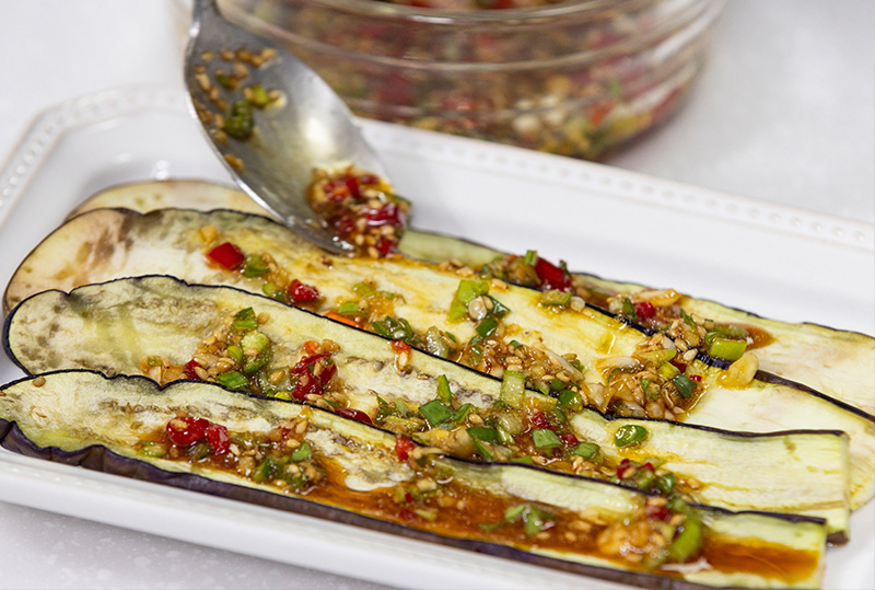고루 섞은 양념장을 구운 가지 위에 발라 줍니다.