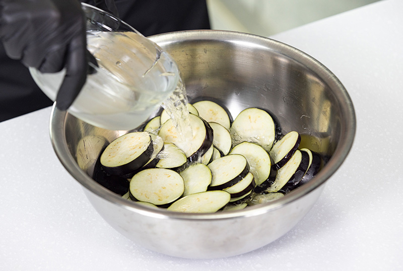 물 한 잔에 소금 한 숟갈을 넣고 소금을 녹인 뒤 가지를 넣어둡니다. 가지가 물에 잘 젖게 수시로 뒤적여 줍니다. 10~15분 동안 두면 숨이 죽습니다.