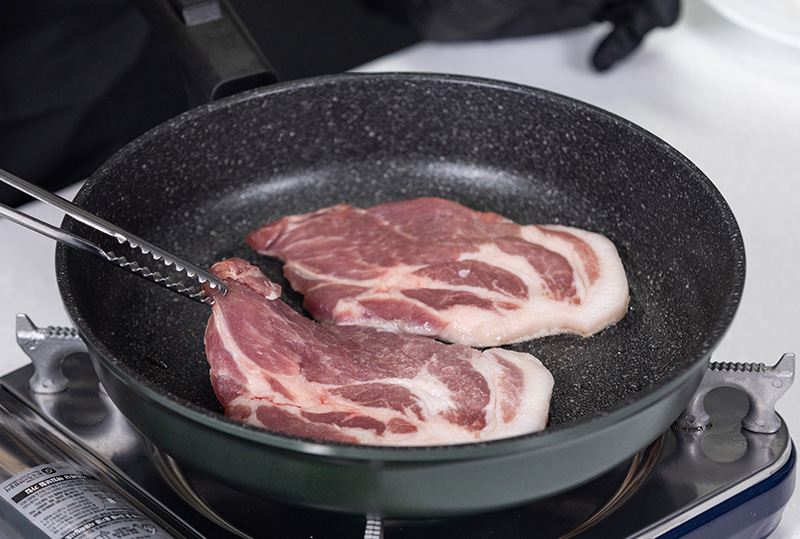 팬에 기름을 조금 두르고 간한 돼지고기를 굽습니다.