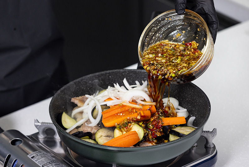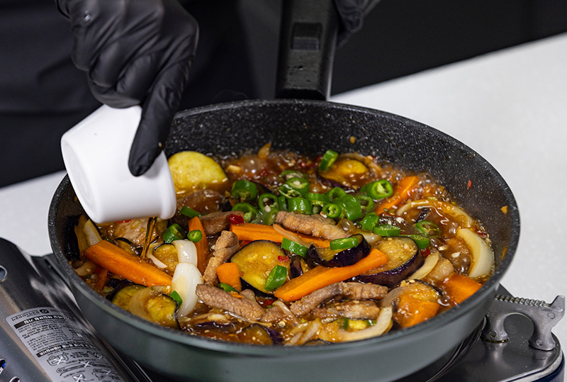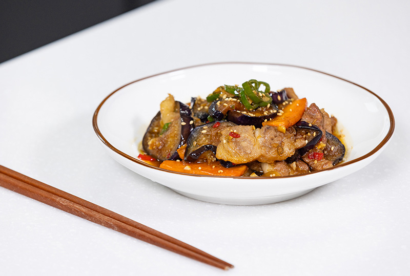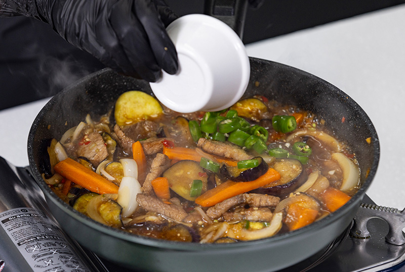 구운 고기에 기름을 조금 제거한 뒤 준비한 가지와 당근, 양파에 가지구이 양념장을 넣고 볶습니다.