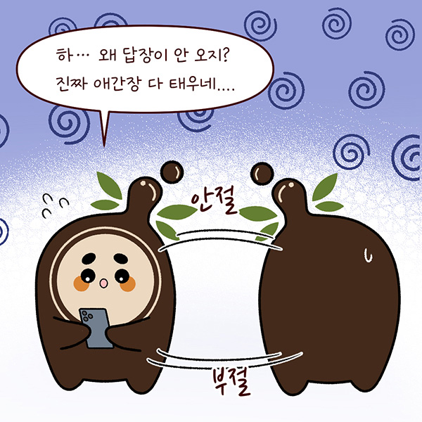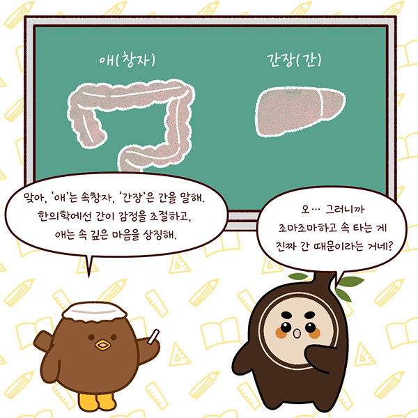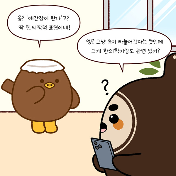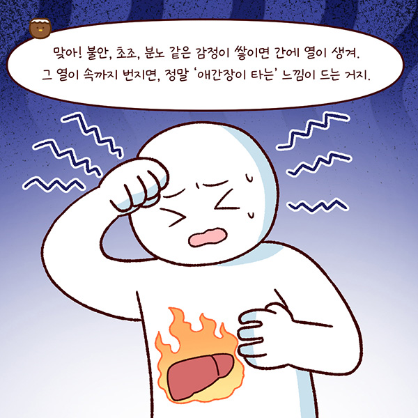 속이 타들어가듯 몹시 애가 타고 초조한 마음 상태를 표현하는 우리말입니다. 보통 누군가를 기다릴 때나 일이 잘못될까 불안할 때 자주 쓰입니다. 여기서 ‘애’는 속마음, ‘간장’은 간(肝)을 뜻합니다. 한의학에서는 간이 감정을 조절한다고 보며, 긴장과 불안이 쌓이면 간열(肝熱)이 생겨 ‘속이 끓는 듯한’ 상태가 됩니다. 마음의 건강도 간의 균형에서 시작된다는 뜻을 담고 있습니다.