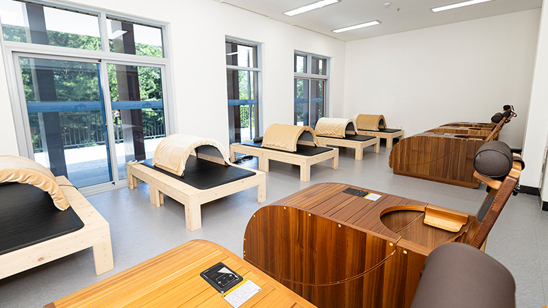 그 중에서도 가장 주목할 만한 곳은 치유의 숲 초입에 있는 산림치유센터다. 프로그램실, 건강측정실, 차담실 등이 마련된 이곳에서 이용객들은 편안하게 휴식을 취하며 건강을 관리할 수 있다. 숲속에서 자연을 바라보며 몸과 마음의 건강을 돌 볼 수 있는 다양한 산림치유 프로그램도 운영한다. 자연의 소리, 향기, 경관, 촉감, 맛을 체험하며 신체 활력을 증진하는 ‘숲속 오감걷기’, 소도구 운동을 통해 경직된 신체를 이완하는 ‘듣다’와 ‘이완 스트레칭’, 차와 함께 대화하며 마음의 온기를 나누는 ‘나누다’, 고요한 치유의 숲에서 나의 마음을 바라보는 ‘보다’, 온열 장비로 몸의 순환을 열어 건강을 도모하는 ‘열다’ 등이 대표적이다. 이외에도 숲속 식물을 활용해 나만의 손수건을 만드는 ‘물들다’와 같은 공예 프로그램도 있다. 프로그램은 대부분 1~2 시간 정도 소요돼, 편안한 마음으로 프로그램을 즐기다 보면 하루가 금세 흘러간다.
