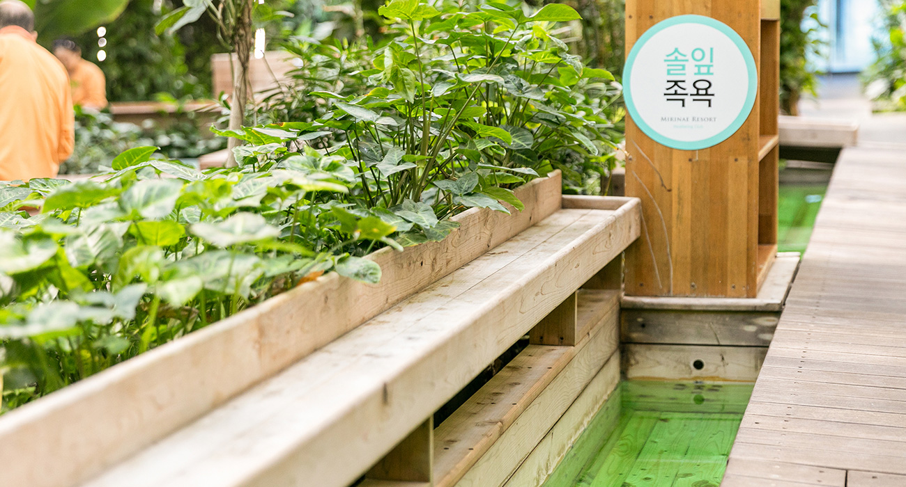 개천처럼 흐르는 족욕탕에 발을 담그면 그대로 자연에 스며드는 느낌이다. 거품이 올라오는 버블, 보랏빛 아로마, 초록빛 솔잎 등 종류별로 즐길 수 있다. 특히 솔잎 족욕은 시원한 향이 머리를 맑게 하고 스트레스를 해소하는 데 탁월하다.