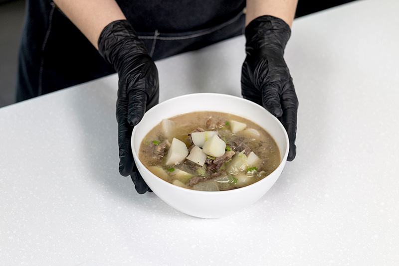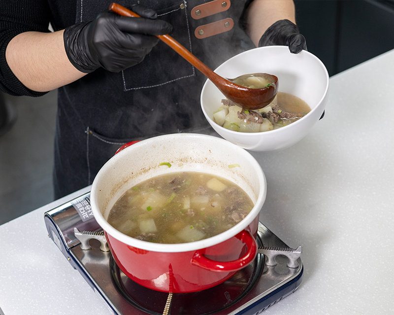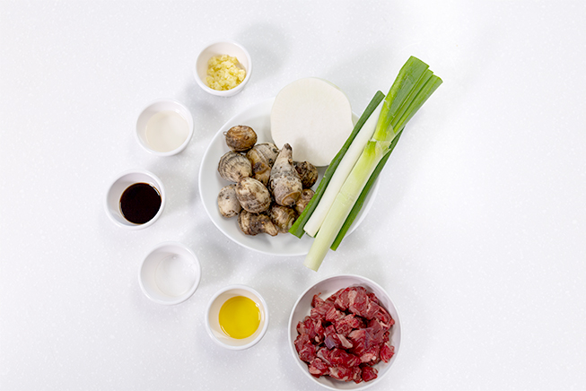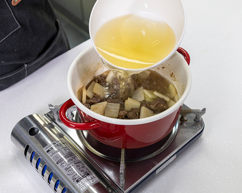 소고기 겉면이 익으면 1에서 만들어 둔 채수와, 한입 크기로 썰어둔 무를 넣어 고기가 부드러워질 때까지 뚜껑을 열어두고 끓입니다. 불은 센 불로 해주세요.