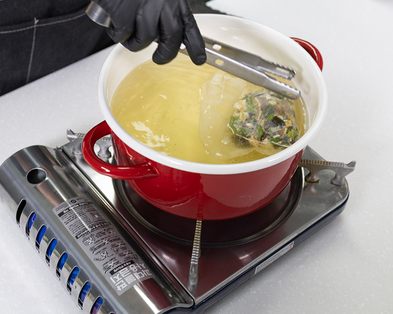 채수를 만들 때 다시마를 오래 끓이면 국물이 탁해지므로, 중간에 꺼내 주세요.