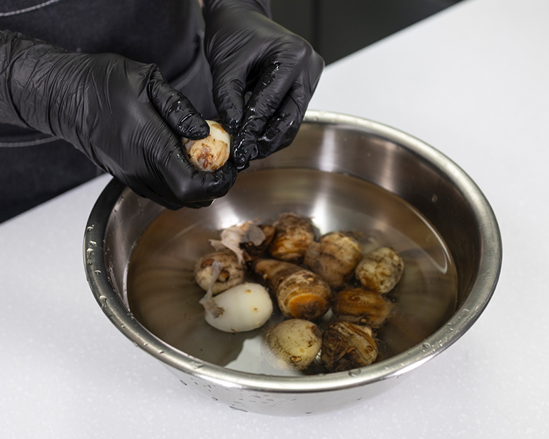 자, 그럼 장갑을 끼고 토란을 다듬어서 요리를 해볼까요? 이미 손질이 되어있는 토란을 사서 요리를 해도 좋습니다.