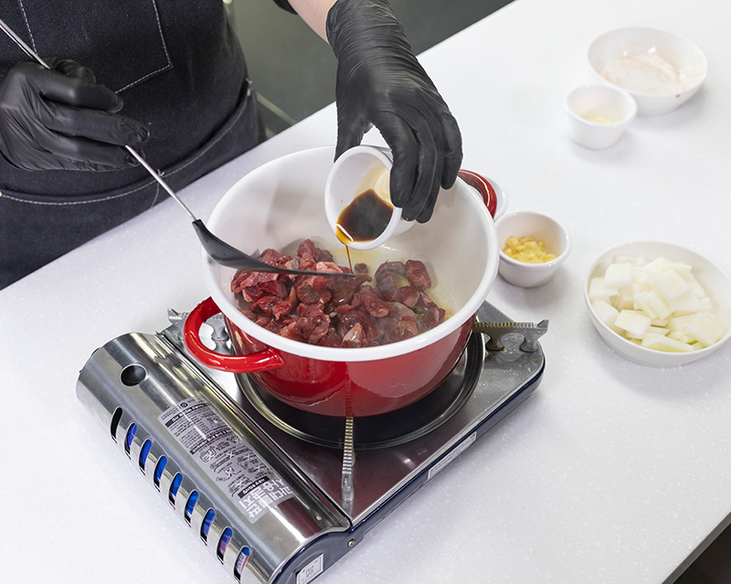 냄비에 소고기와 들기름, 정종, 국간장, 다진 마늘을 넣어 중불에서 볶습니다.