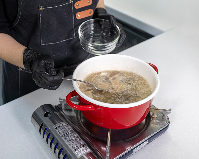 끓어오르는 거품(불순물)은 걷어내 줍니다. 소금으로 간을 합니다.