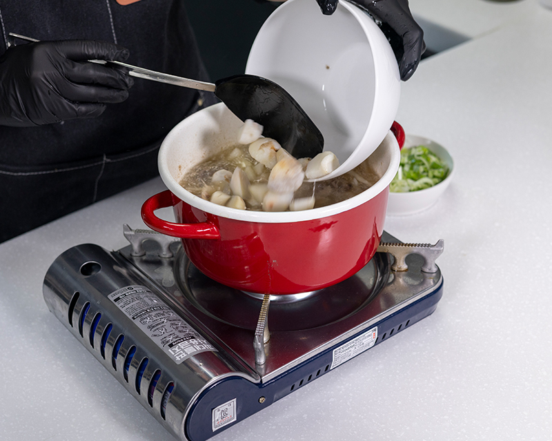 먹기 전에 손질해 둔 토란과 파를 넣으면 토란이 부서지는 것을 막을 수 있습니다.