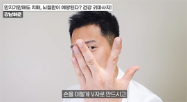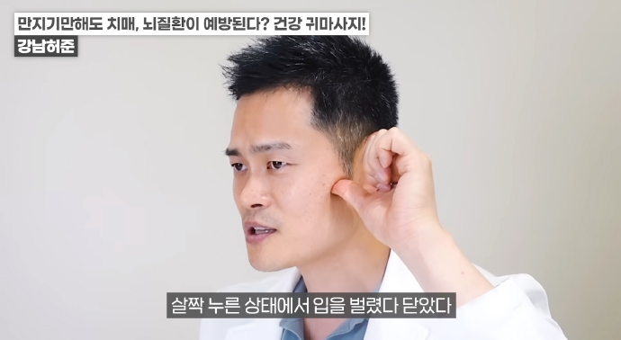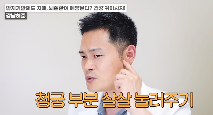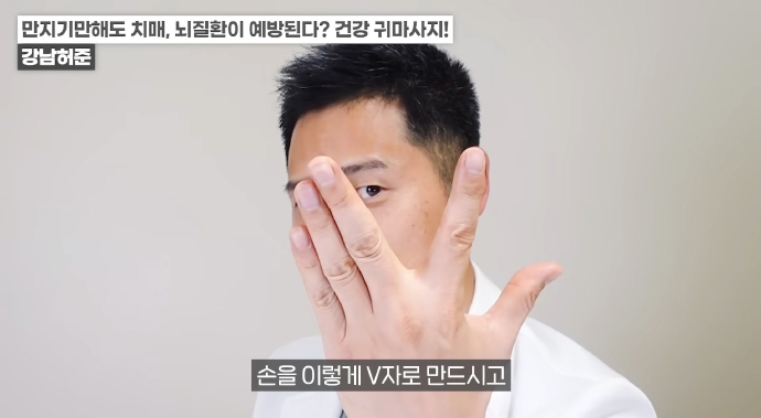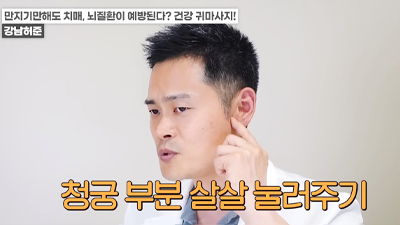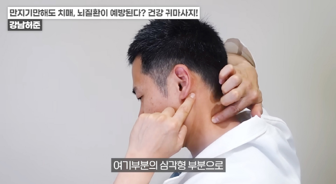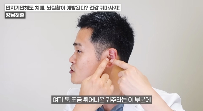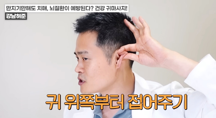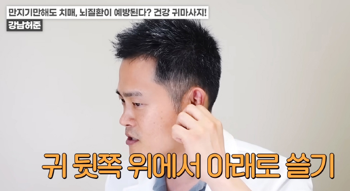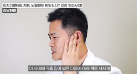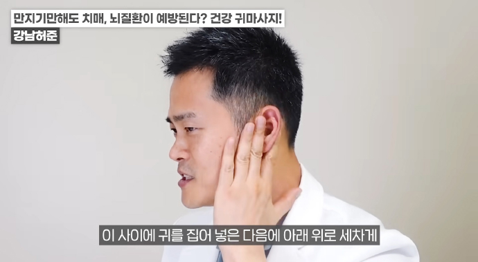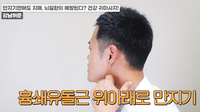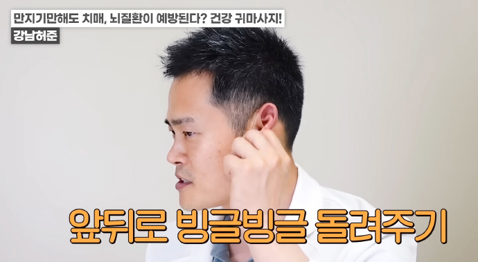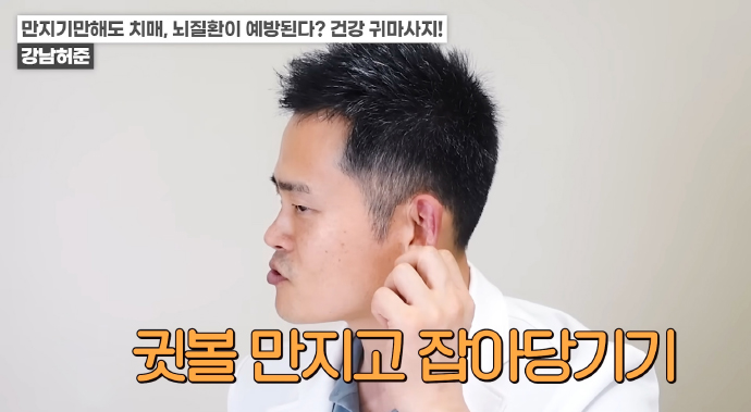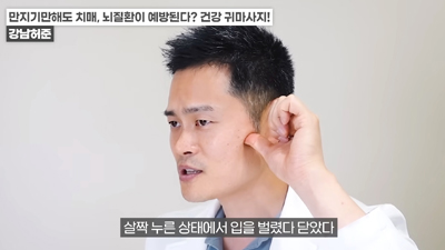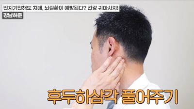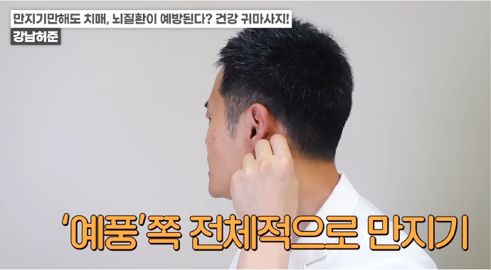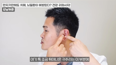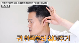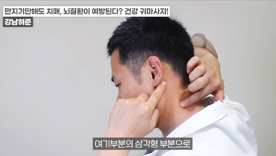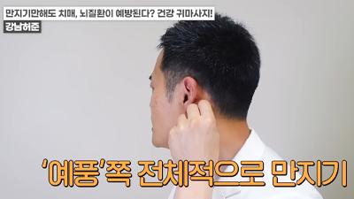 왼쪽 귀의 경우 반대쪽인 오른손 엄지손가락으로 귓불 안쪽을 위에서 아래로 지압이 되는 정도의 세기로 쓸어내린다. 위에서 아래로 꾹꾹 눌러줘도 좋다. / 귀 뒷부분의 혈액순환도 중요하다. 왼쪽 귀의 경우 왼쪽 손을 이용해 뒤쪽 부분을 지압하듯이 위에서 아래로 쓸어내린다. 각 5회 반복한다.