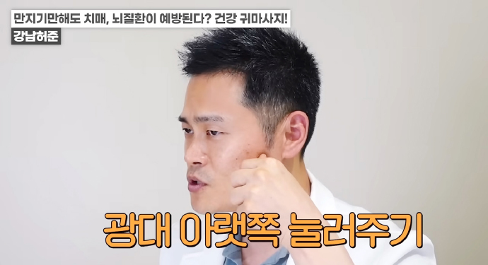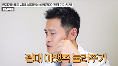 광대 아랫부분에 쏙 들어간 자리를 엄지손가락으로 누른다. 살짝 누른 상태에서 입을 벌렸다 닫았다 몇 번 반복하면 조금 더 깊은 자극을 느낄 수 있다.
