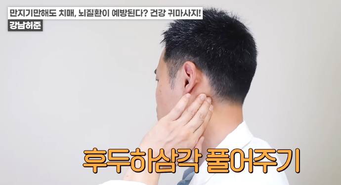 귀 뒤쪽에서 머리 뒤쪽으로 삼각형 부분의 움푹 들어간 부분인 후두하삼각을 전체적으로 잘 풀어주거나 엄지손가락으로 꾹꾹 눌러준다. 좀 더 강한 자극을 원하면 후두하삼각을 누른 상태에서 고개를 움직인다.
