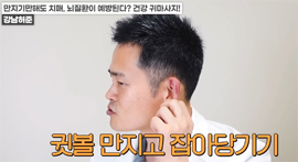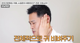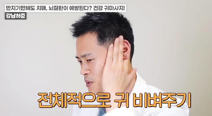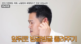귀의 위쪽과 중간 부분을 접어준다. 척추가 안 좋은 경우 연골 있는 부분에 통증이 느껴질 수 있다. / 귓불을 만져주거나 잡아당기는 동작을 5회 반복한다. / 귓불을 앞으로 5회, 뒤로 5회 돌린다.
